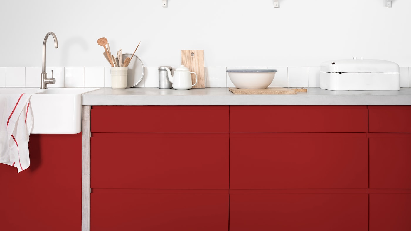 Si vous vous sentez l’âme d’un aventurier, pourquoi ne pas tenter de peindre vos placards de cuisine dans une couleur audacieuse ? Un rouge qui attire l’œil ajoutera instantanément de l’intérêt à votre pièce et créera un bel effet. Contrastez un rouge profond avec un plan de travail, des murs et un évier blancs, pour une allure moderne, mais réalisable. Pour adoucir, utilisez le plan de travail et les étagères pour exposer vos ustensiles et votre vaisselle préférés dans des tons neutres.