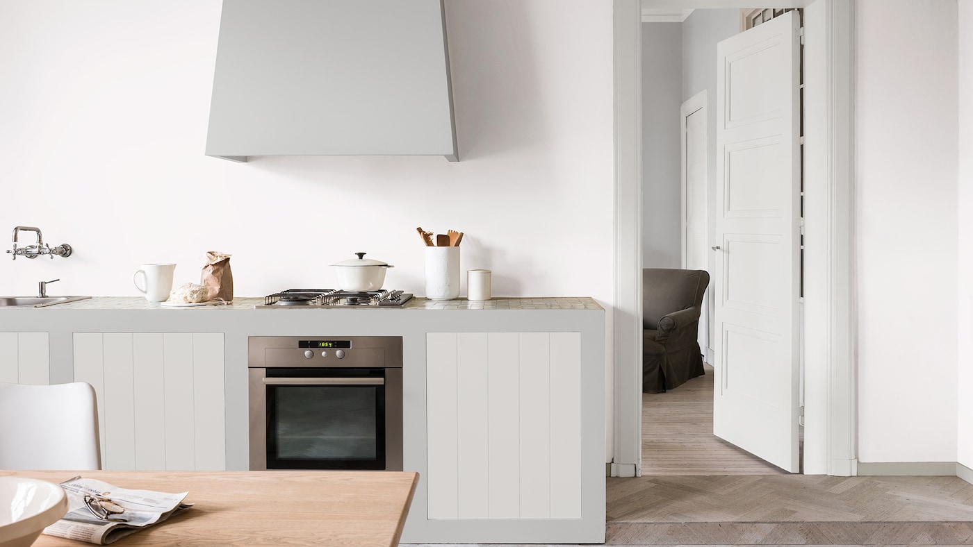 Pour un relooking rapide et facile, mais néanmoins efficace, essayez de peindre certaines parties seulement de vos placards. Les gris froids et blancs frais donneront un style scandinave chic. Des tables en bois et du parquet créeront une ambiance sophistiquée et décontractée, en toute simplicité. Agrémentez de quelques décorations sobres et de simples casseroles blanches.