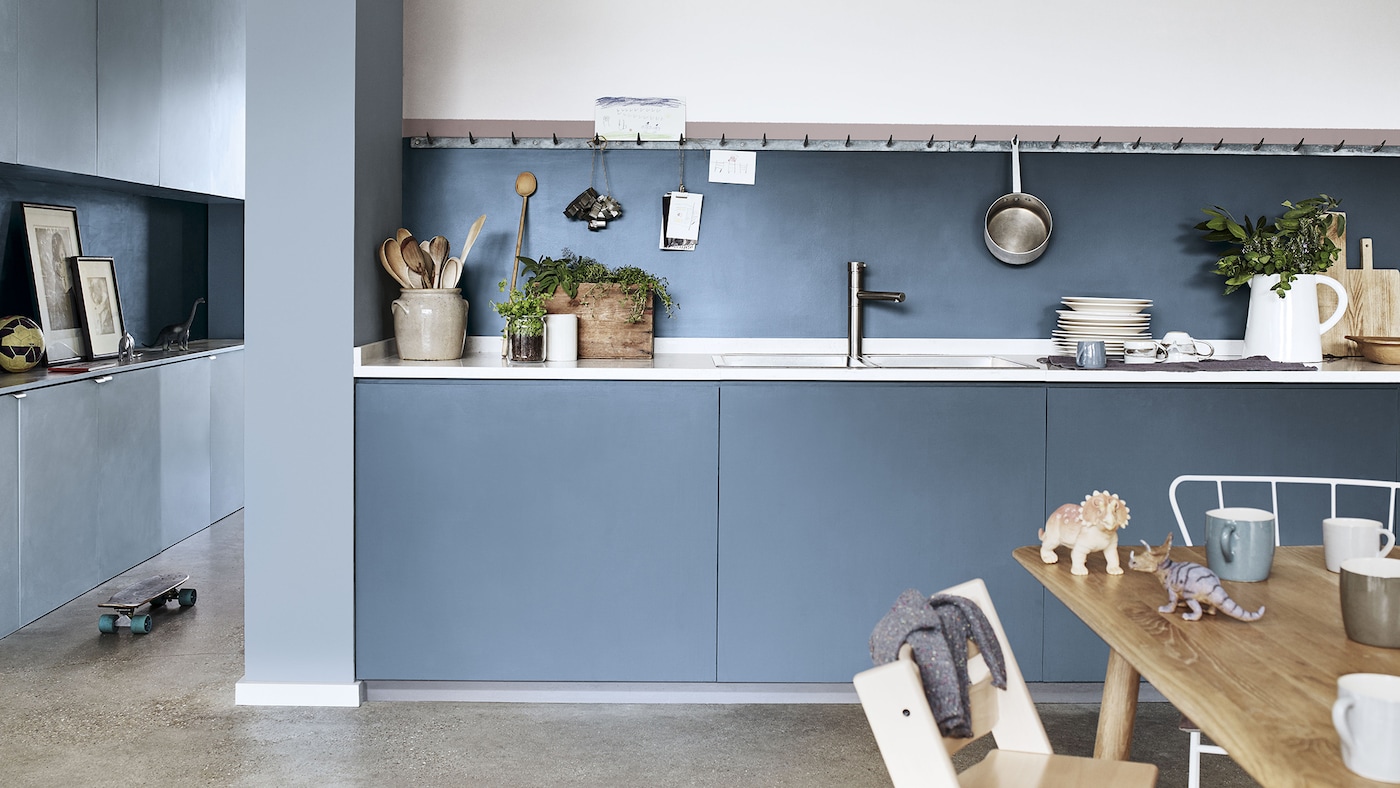 Pour une cuisine élégante et paisible, accordez la couleur des armoires à celle de la crédence. Optez pour un bleu froid, afin de donner à la pièce une impression d’espace et de continuité. Complétez les tons froids par une table et des chaises en bois chaleureux. Équilibrez la transformation en décorant le plan de travail blanc avec des planches à découper classiques en bois et des ustensiles de cuisine.