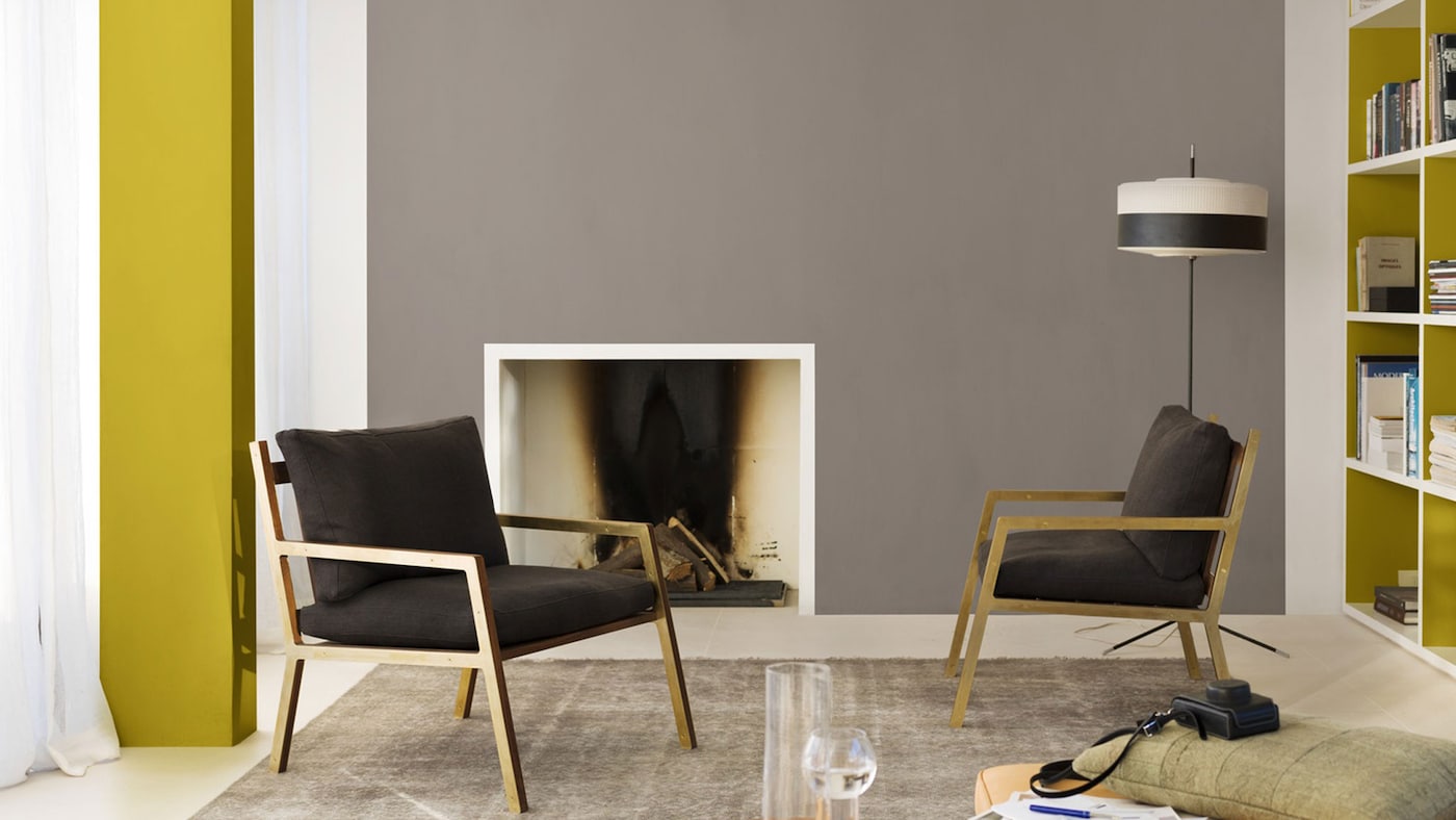 Ce séjour invite à la lecture, à la conversation et à la détente. La surface gris Ombre sur le mur est encore mieux mise en valeur par l’encadrement blanc. Le jaune Madras apporte une touche d’aventure dans cette scène intimiste.