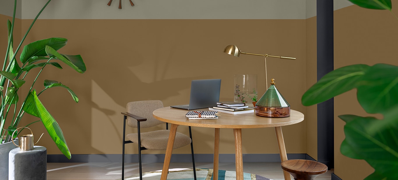 Ce bureau qui associe la chaleur de l’orange à la fraîcheur du rose dégage une impression de vitalité empreinte de calme, l’idéal pour trouver la concentration et l’inspiration. Le mobilier en bois et quelques éléments décoratifs originaux complètent l’ensemble, tandis que le tapis coloré rehausse l’esprit aventurier de cette palette de couleurs.