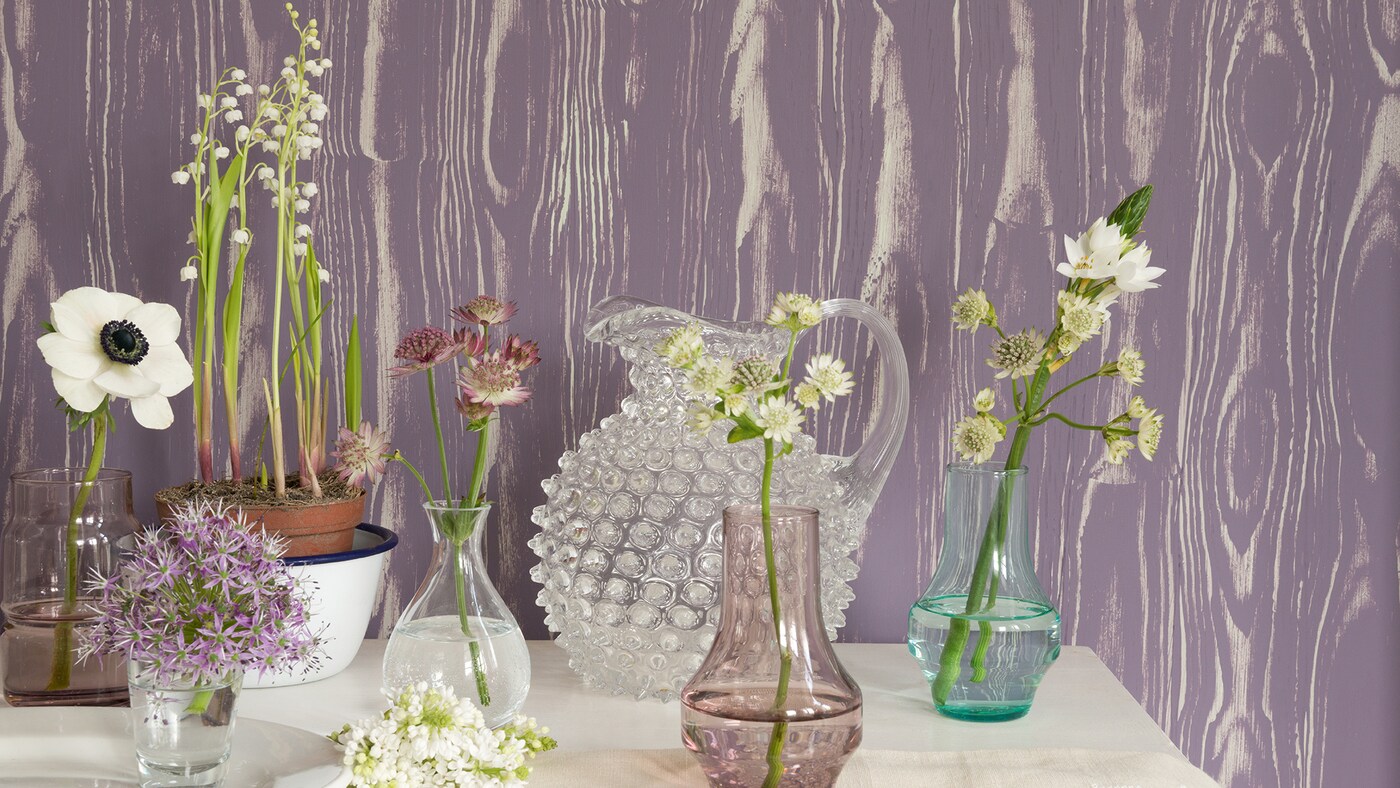 Utilisez un outil à veiner pour créer des effets bois sur vos murs dans la couleur de votre choix. Un vert sauge associé à un prune riche crée un contraste unique avec les tons naturels.