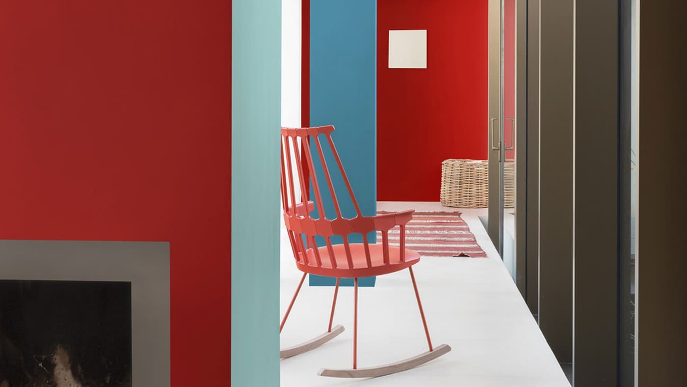 Grâce au jeu du rouge et du bleu, deux contraires naturels, ce loft a maintenant un caractère bien à lui. Le résultat est surprenant : clair et joyeux. Vous retrouvez les teintes les plus chaudes autour du feu ouvert : gris Ombre et Rouge Absolu.