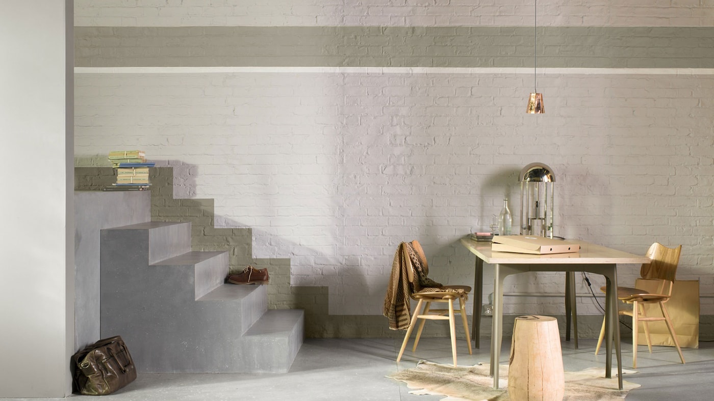Une composition intimiste en trois couleurs. Sobre, mais tout sauf monotone. Le mur de pierre peint dans l’élégant Gris Versailles est traversé de deux bandes horizontales. La forme de l’escalier est reproduite comme une silhouette en gris Ombre.