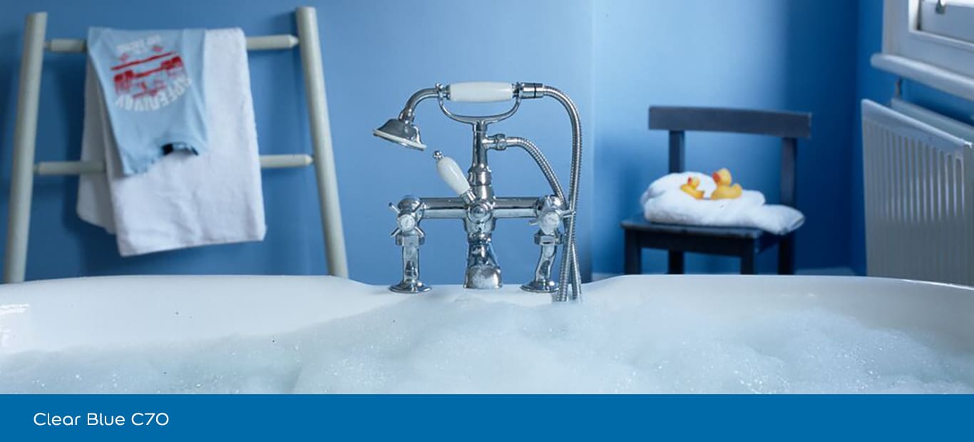 In de badkamer versterkt blauw op natuurlijke wijze de link met water. De kleur straalt frisheid en zuiverheid uit en geeft de ruimte een cleane, verzorgde uitstraling.