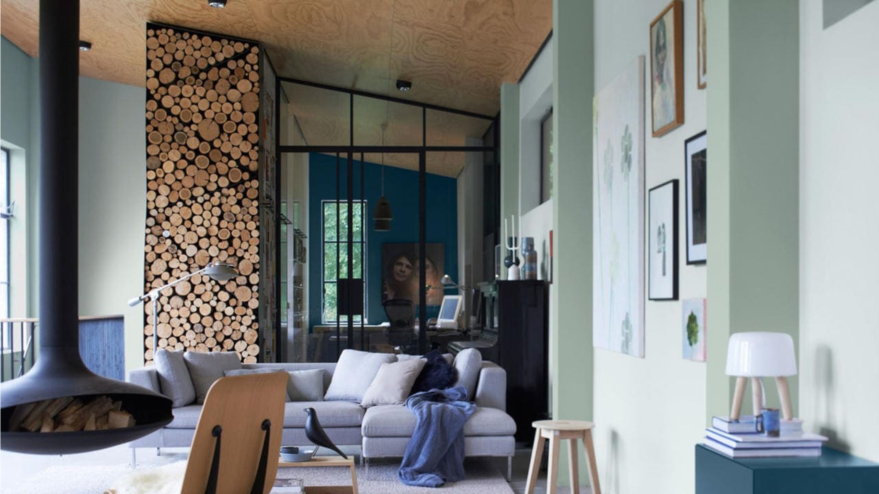 De essentie van Finland vertaald in een unieke woonsfeer. De muren zijn geschilderd in Balanced Mood en de uitspringende gedeelten in Balanced Spirit. Door het toonverschil tussen beide tinten wordt het lijnenspel van de ruimte geaccentueerd. De zwevende haard straalt een behaaglijke warmte uit. De houttekening in het plafond en de kast met boomstammen herinneren aan de Finse natuur. Een labyrint van water en land, van uitgestrekte meren en naaldwouden.
